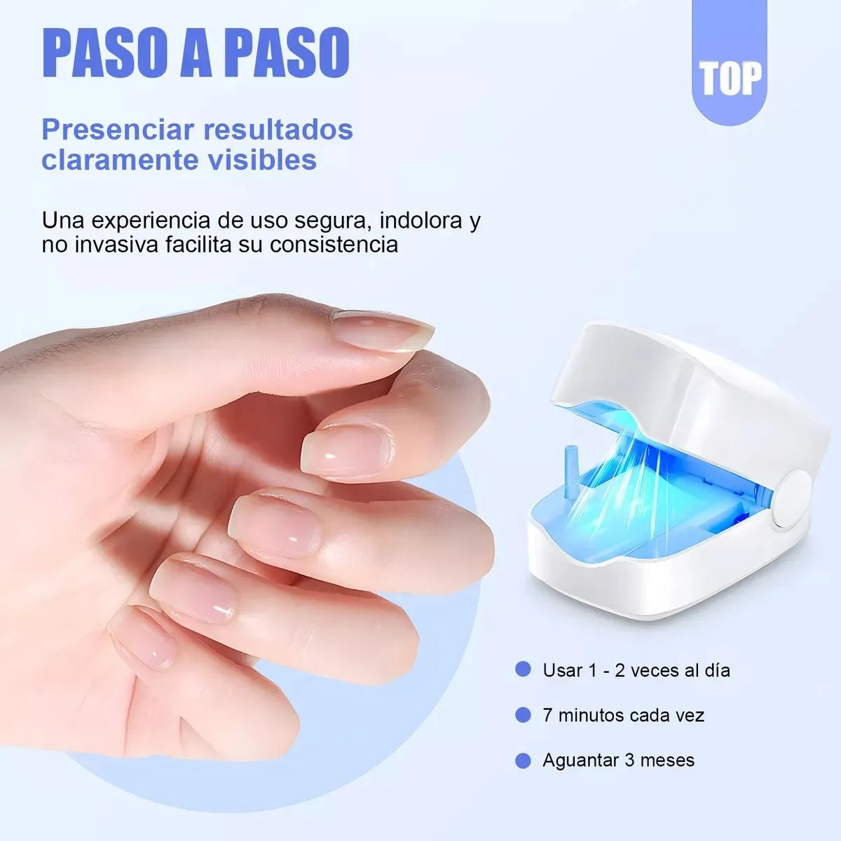 Con solo 7 minutos dos veces al día, BrillaUña ha mostrado una eficacia de hasta 97% en 6 meses. Portátil, seguro y fácil de usar en casa o de viaje.